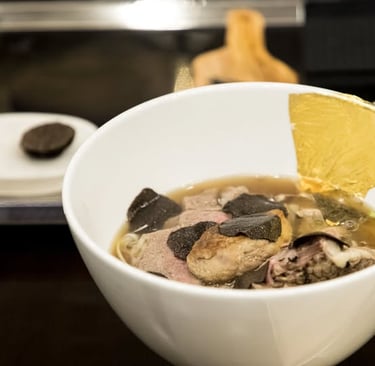 According to Chef Lê Trung, the dish still follows traditional pho methods (beef & chicken bones simmered for 48 hours with cinnamon and star anise), but is elevated with rare imported ingredients:
